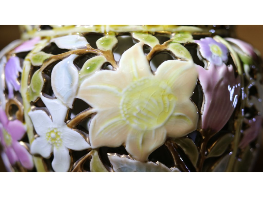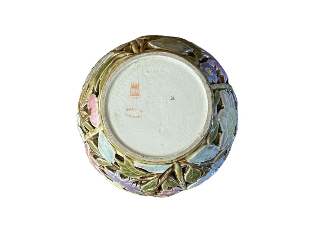 Bemutatás: kerek, talpas, duplafalú kaspó, gazdagon áttört, csipkeszerű peremmel. Felületét kézi festésű, rokokó jellegű virágkompozíció díszíti. A rózsaszín árnyalatú nyíló virágok mellett apróbb kerti virágokra emlékeztető motívumok jelennek meg, indás levelezettel kiegészítve. A díszítést finoman húzott aranykontúrok emelik ki, amelyek a virágok szirmain és a perem vonalán is végigfutnak. A festés aprólékos kézimunka, amely jól tükrözi a Zsolnay gyár 19. század végi kézműves minőségét.