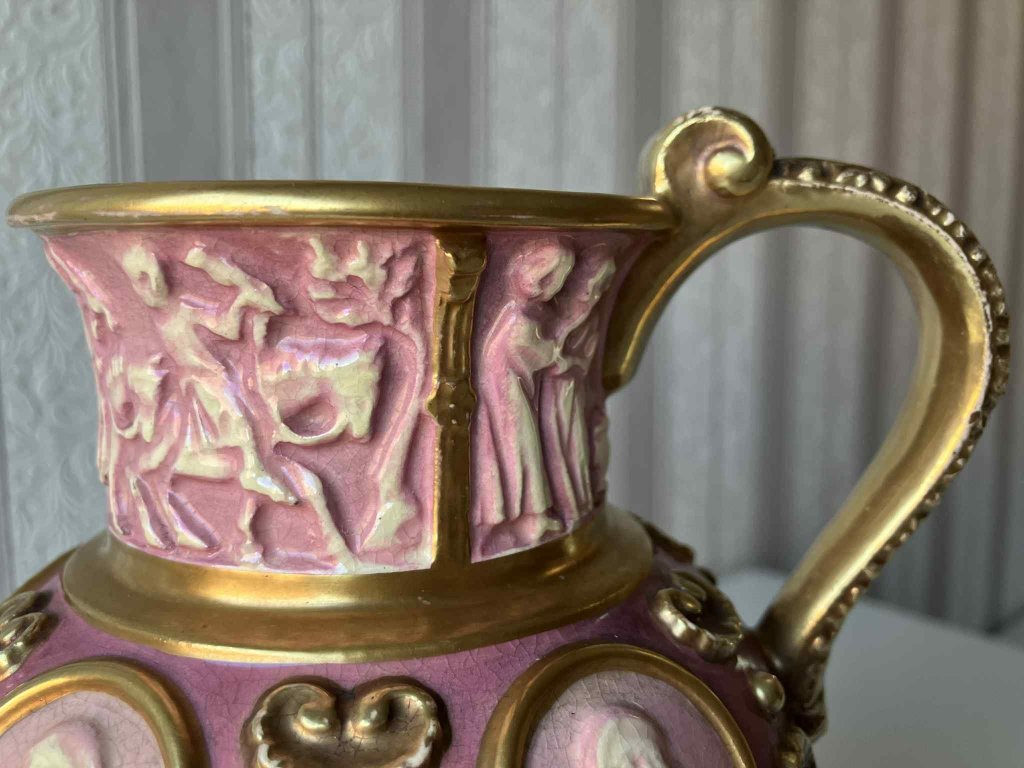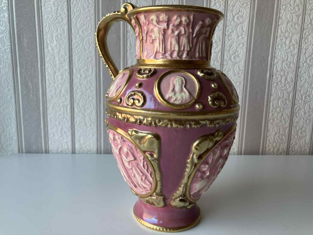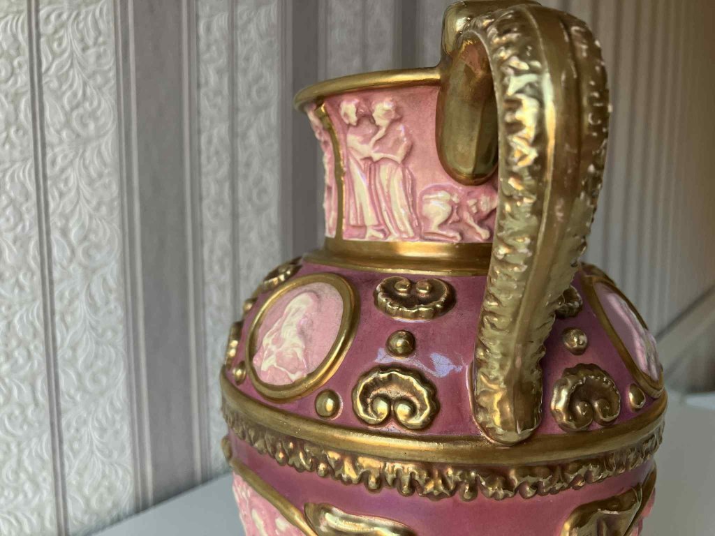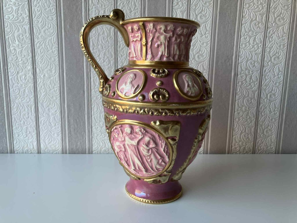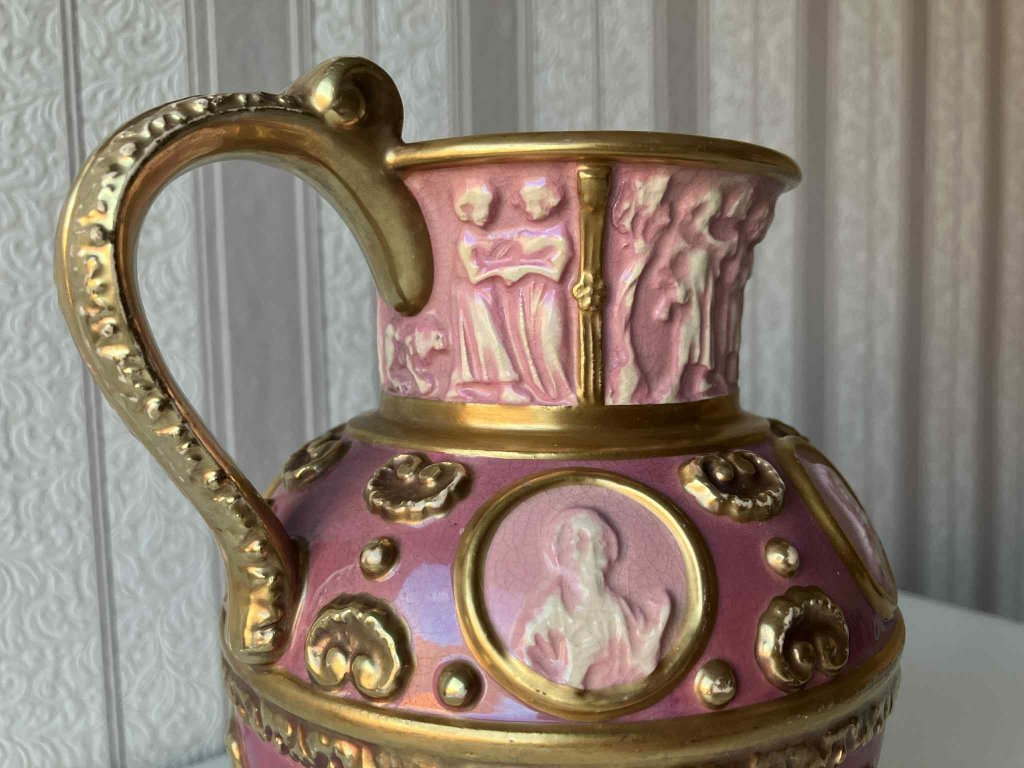 Rózsaszín mázzal, gazdag aranyozással, középkori ihletésű metszetekkel.
