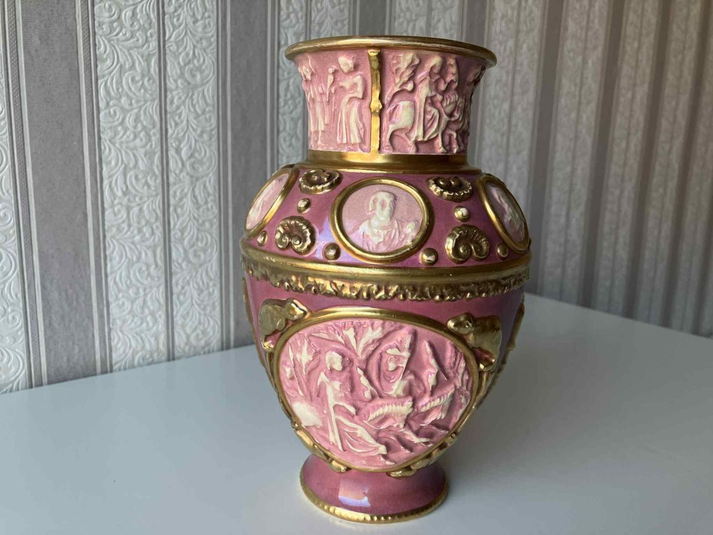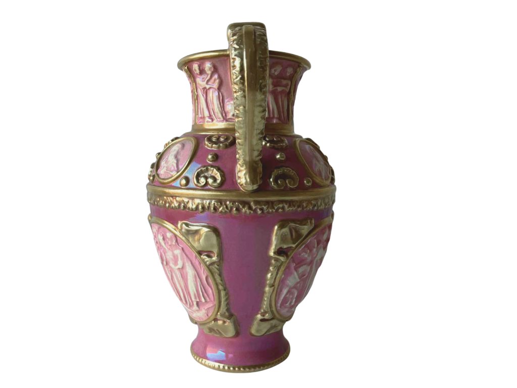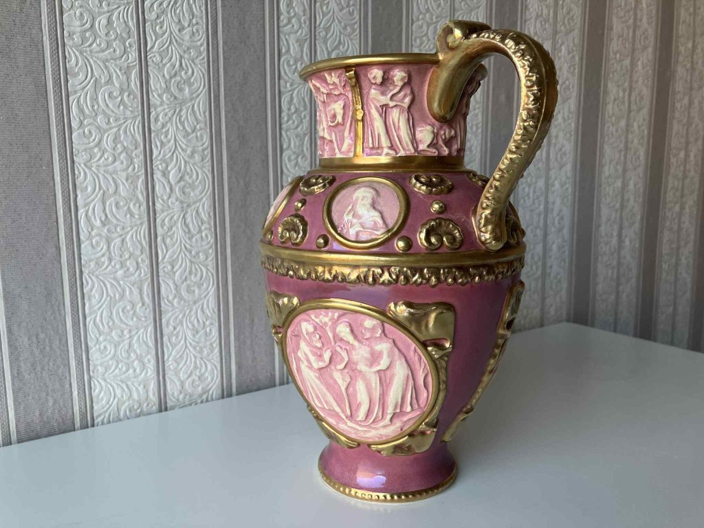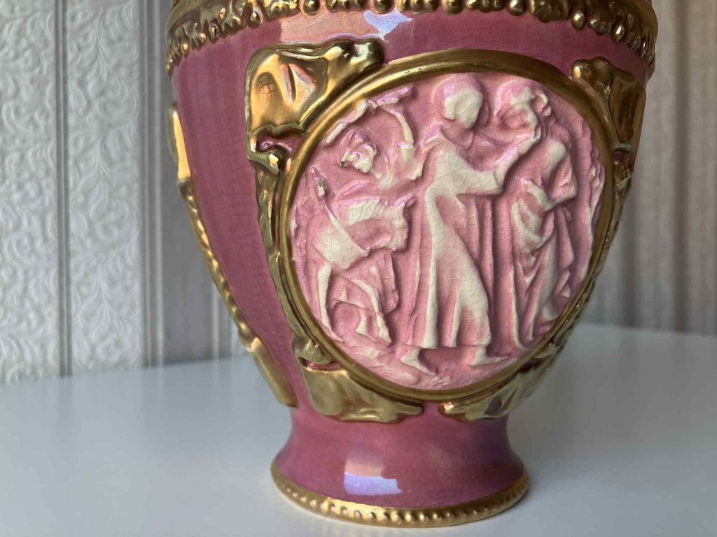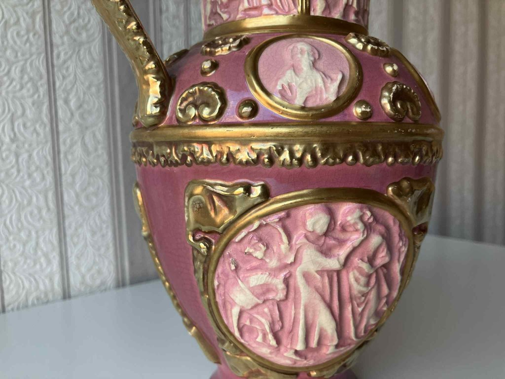 Rózsaszín mázzal, gazdag aranyozással, középkori ihletésű metszetekkel.