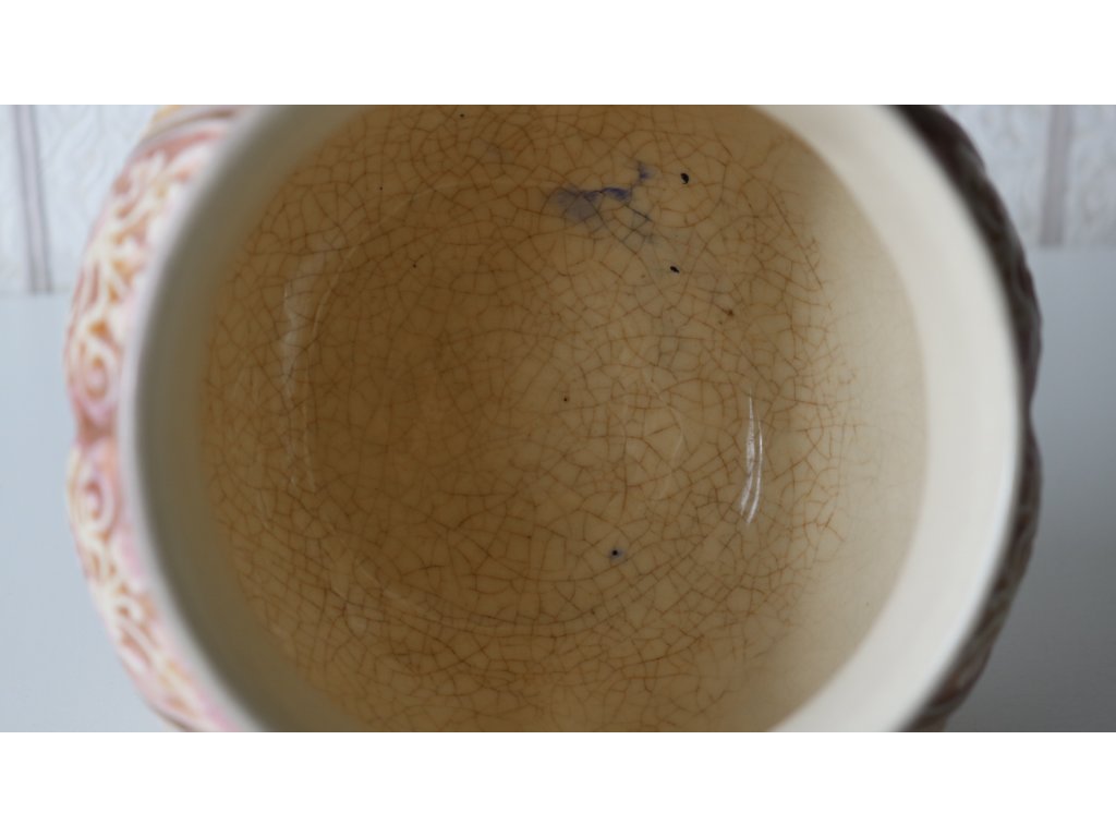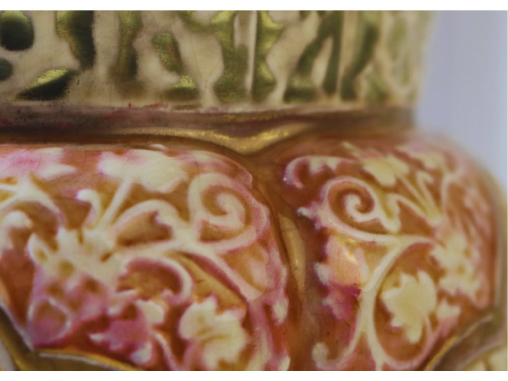 Állapot: a kaspó gyűjtői állapotban maradt fenn. Az aranyozás kopott, de eredeti, nem utólagos. Az alján hajszálrepedések találhatóak (befotóztam) illetve a belsejében is vannak repedések, mivel kaspóként volt használva, ezt is fotóztam , a kaspó felületén erőteljes, korra jellemző mázrepedezettség (crazing) figyelhető meg. Törés vagy restaurálás, repedés, csorbulás nincs.