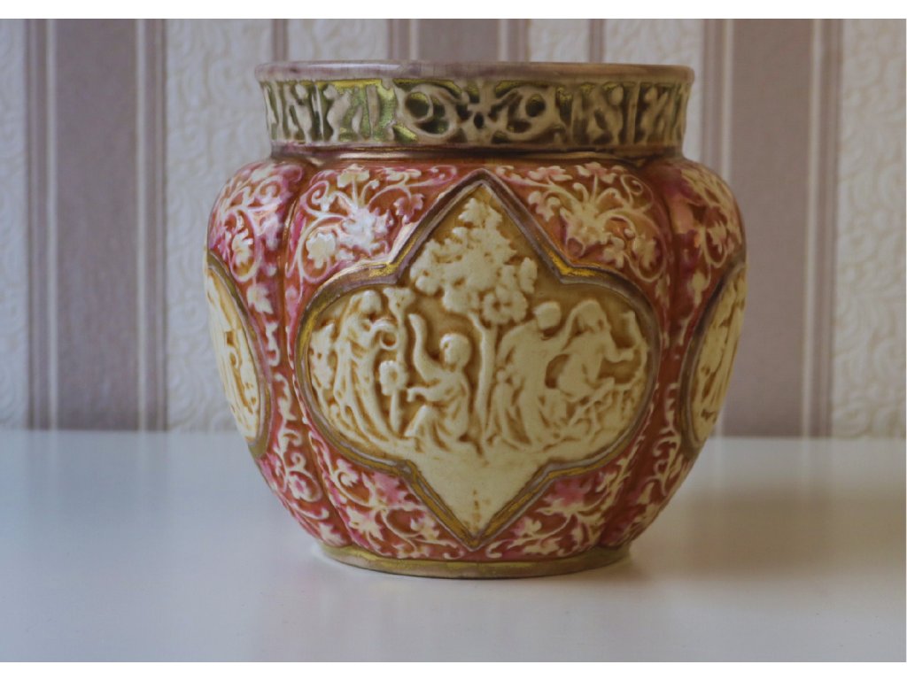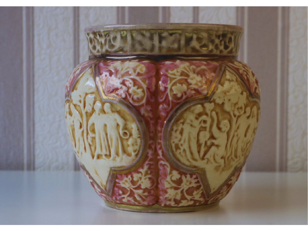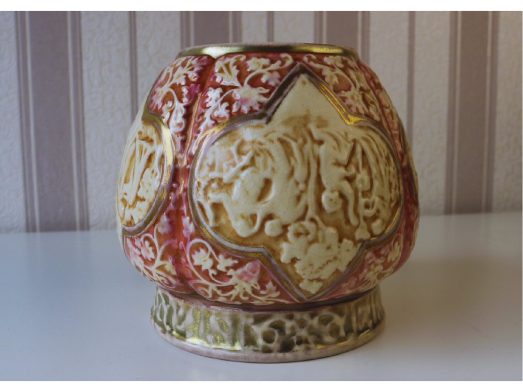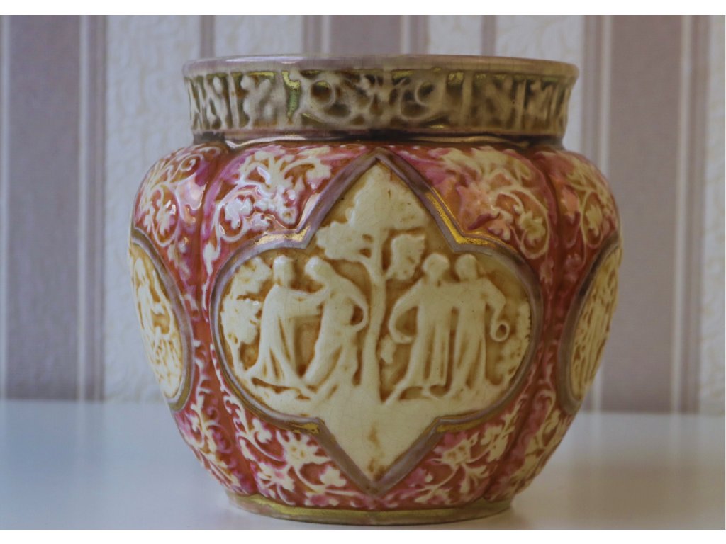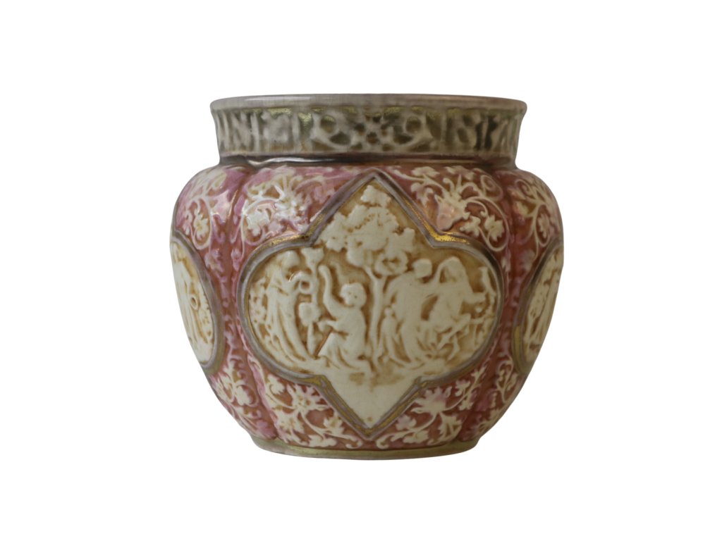 Zsolnay Old Ivory kaspó, bibliai jelenetekkel. Formaszám: 3080
