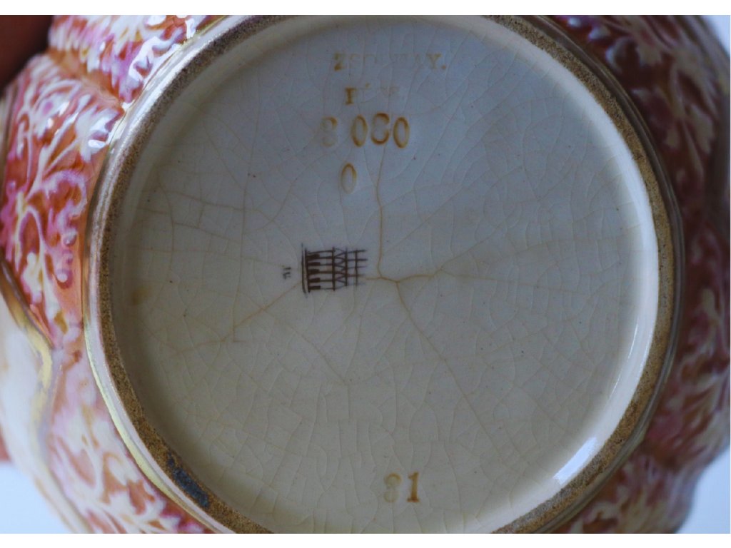 Jelzés: az alján arany öttornyos Zsolnay jelzés Pécs jelzés, masszába nyomott 3080-as formaszám,
